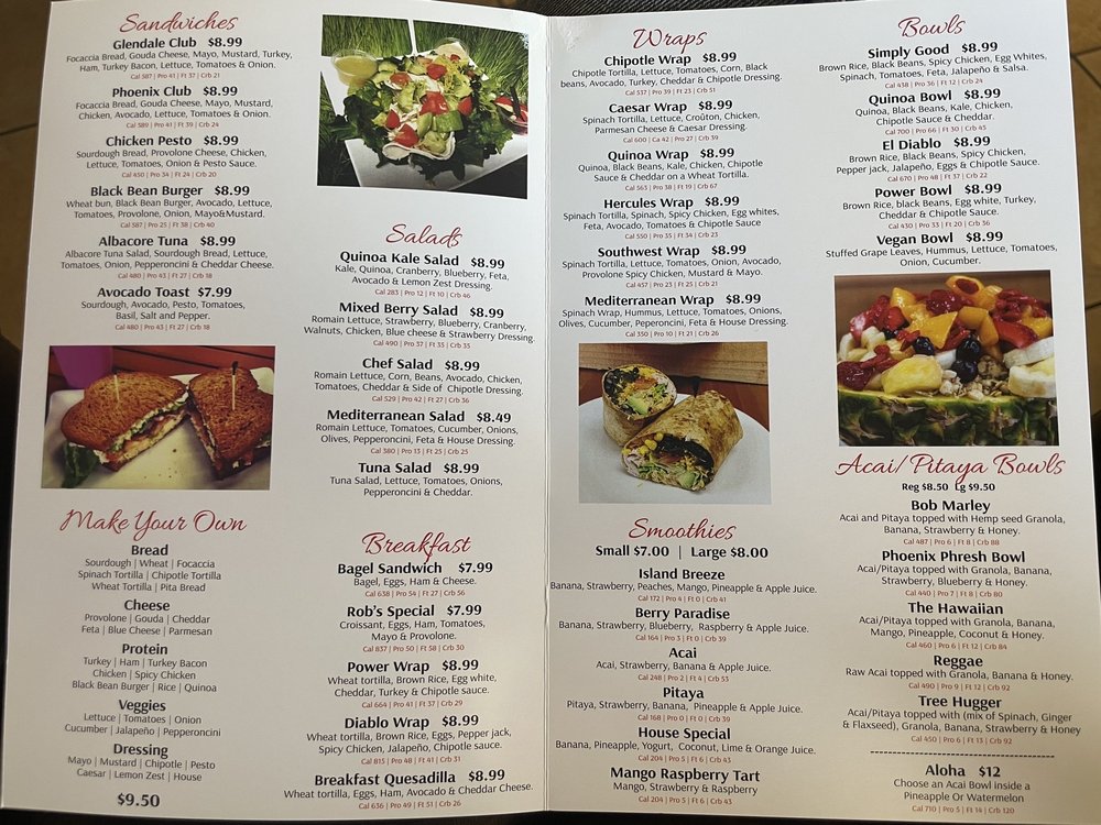 Welcome to Phoenix Phresh Cafe, where sandwiches and smoothies shine in a casual, inviting atmosphere. Located at 5830 W Thunderbird Rd in Glendale, AZ, this cafe specializes in fresh, wholesome options that cater to all dietary preferences, including an array of vegan choices. The menu features hearty breakfast items like the Bagel Sandwich and Robs Special Croissant, perfect for kickstarting your day. Their smoothies, such as the Bob Marley and Island Breeze, offer a refreshing boost thanks to vibrant fruits and nutritious ingredients.
